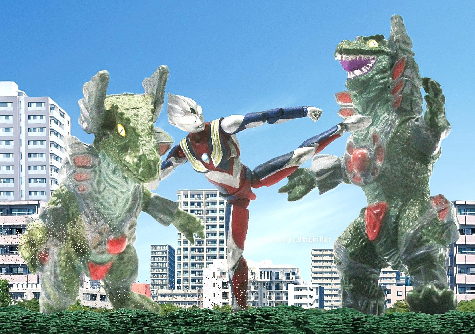 『ウルトラマンティガ』第23話のスチール写真を、超動αウルトラマンティガと、ウェポナイザー1号・2号のフィギュアを用いたデジタルジオラマで再現してみました。 両者とも画像上で色を足したり、不自然な反射を消したり、発光風加工したりでリアルに寄せています。